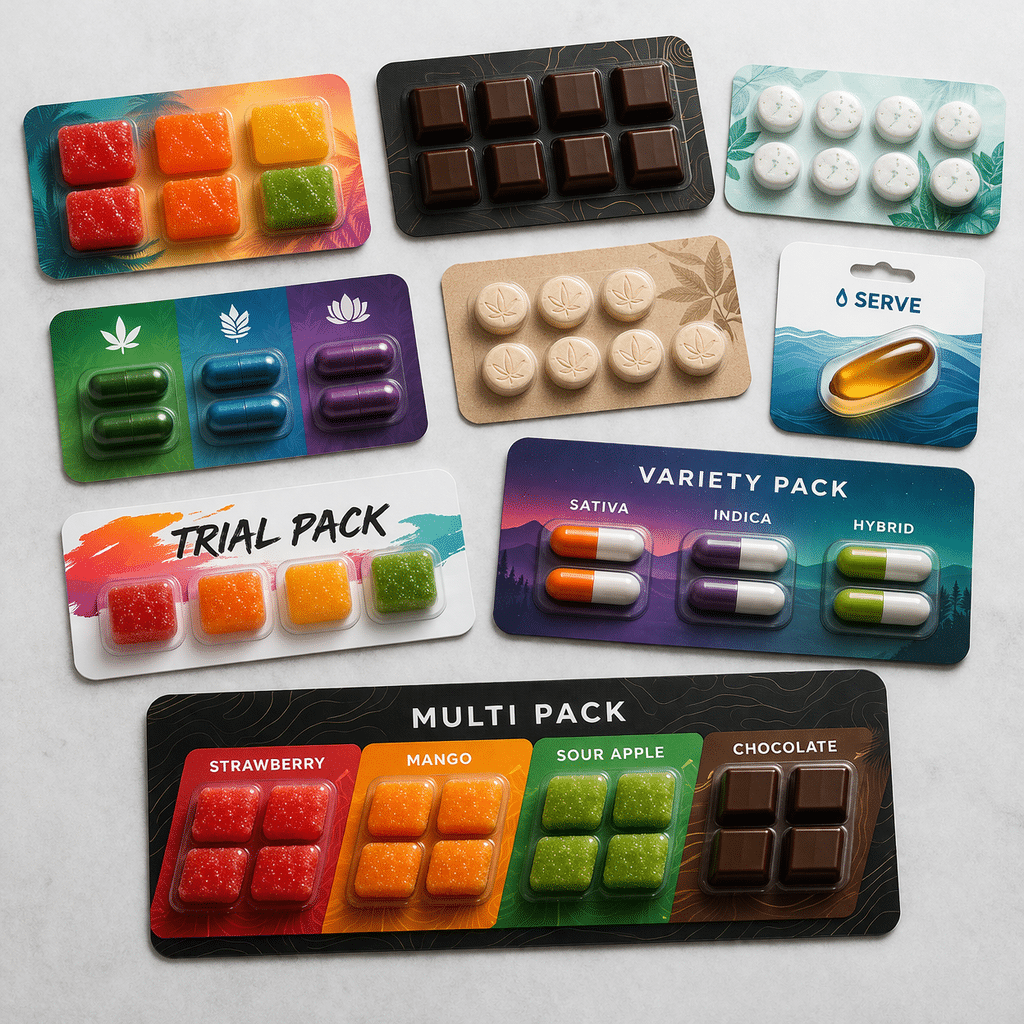 Our blister packs offer child resistant, tamper evident protection for edibles, capsules, tablets, and single serve products with full custom branding.