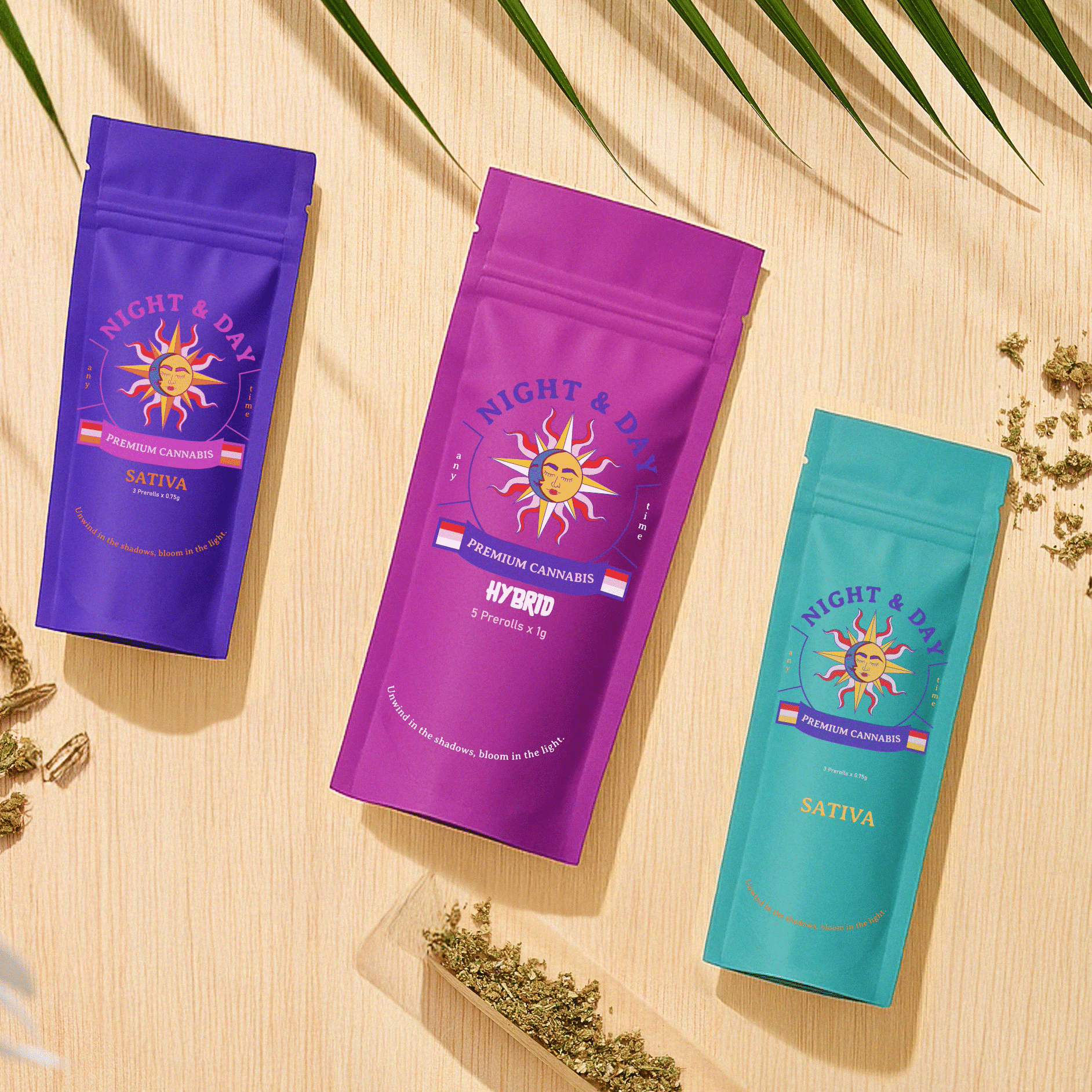 Flat custom mylar bags are ideal for compact formats like pre-rolls, samples, or small edibles. These customizable bags include child-resistant heat seals, matte or gloss finishes, and options for transparent or window packaging.